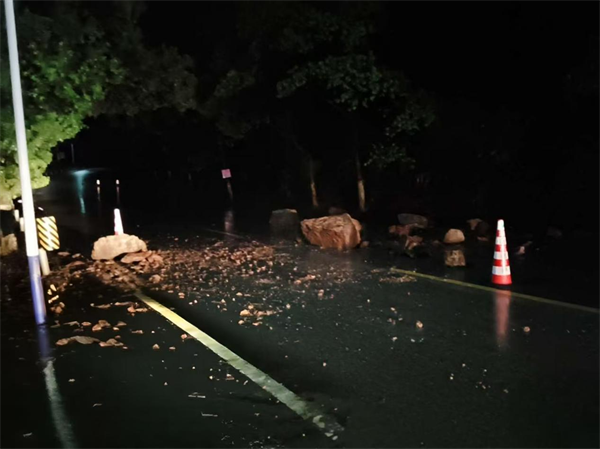 事发现场,坠落岩石散落路面,较大的岩石约有20余块,其中最重的超过300公斤,现场交通阻塞,但未有人员伤亡。应急抢险人员到达现场后,迅速布设安全警示锥,划定危险管控区域,提醒过往车辆减速慢行、谨慎通行,杜绝次生事故发生。同时,作业人员分工协作,高效开展落石清运、路面杂物清扫等作业,全力抢抓抢修进度。经过连夜不间断紧急处置,当日清晨6时,该路段落石全部清理完毕,路面障碍物彻底清除,道路通行秩序全面恢复正常。