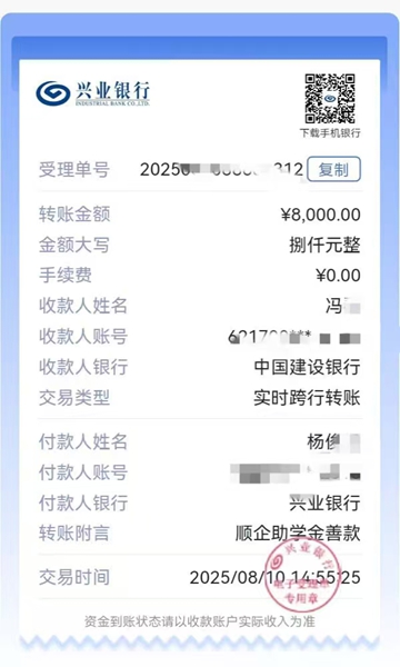 8月10日,一笔8000元的助学善款,从广东省佛山市顺德区跨越千里,汇入湖南省茶陵县舲舫乡祠湾村“防止返贫监测户”冯某家中。这是株洲市派驻祠湾村工作队扶危济困的又一善举。