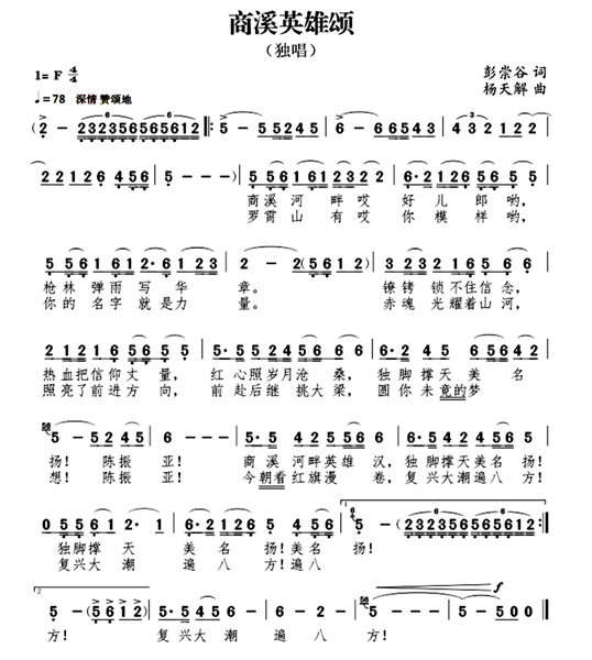 《商溪英雄颂》以意蕴深刻的歌词,深沉细腻的旋律,歌颂了陈振亚烈士短暂而光辉的一生。歌曲体现了他为革命事业生命不息、战斗不止的崇高精神风范,激励着我们为国家富强,民族复兴,为早日实现社会主义现代化贡献力量。
