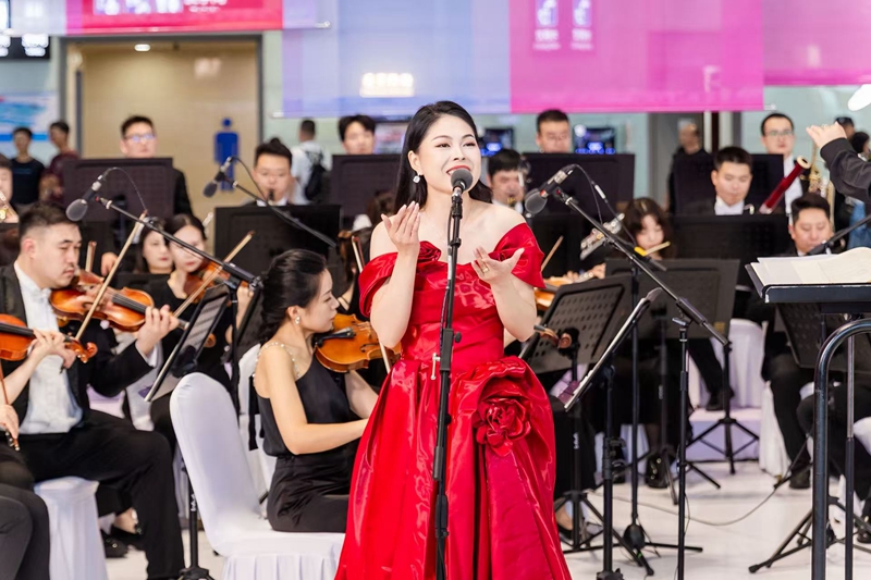 15:00,长沙机场T2航站楼出发大厅内,机场集团党委副书记、总经理崔武松,演艺集团党委副书记、总经理徐蓉,出版集团党委委员、副总经理陈昕,文旅厅推广交流处处长肖正湖共同触摸发光装置,音乐会正式拉开帷幕。一曲《红旗颂》激昂奏响,初登场便引人入胜,其富有张力的节奏迅速抓住了过往旅客的注意力。来自长沙交响乐团的演奏家们汇聚于高空错落而下的巨幅主题垂幔里,在指挥方子翔的执棒下,《激情燃烧的岁月》《一杯美酒》《父亲的草原母亲的河》《浏阳河》等诸多耳熟能详的经典作品接连上演。这些或深情或灵动的旋律如潺潺溪流,流淌在每个人的心间,滋润着人们的心灵。