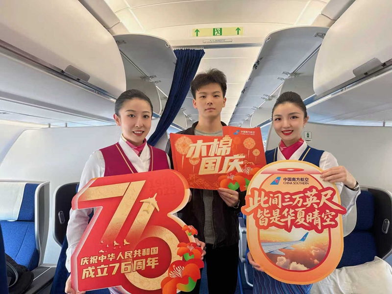 在国庆节来临之际,南航湖南分公司在长沙-北京、长沙-长春的航班上,策划了“木棉国庆·礼赞华诞”主题航班活动,旅客与机组人员在万米高空中共同抒发对伟大祖国的美好祝福。