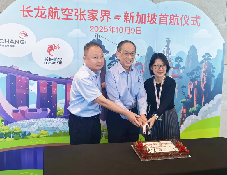 10月9日,浙江长龙航空执飞的张家界至新加坡航班平稳降落在新加坡樟宜机场,标志着张家界历史上首条直飞新加坡的航线正式开通。湖南机场集团党委副书记、总经理崔武松,新加坡樟宜机场集团高级顾问黄文亮,樟宜机场集团市场业务发展副总裁白圻伟,湖南机场集团市场总监及张家界机场、新翔集团等相关领导参加首航仪式。