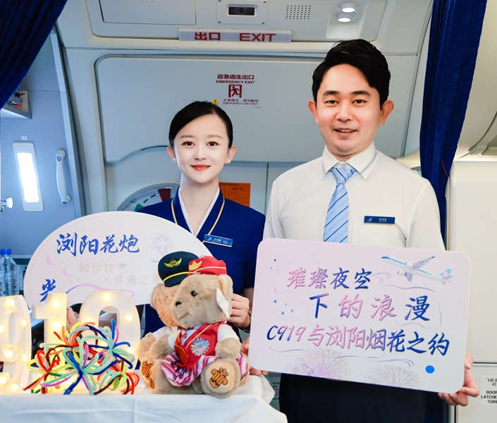 第十七届浏阳花炮文化节即将启幕之际,由南航湖南分公司打造的“木棉湘遇 云端匠心”主题航班精彩启航。这趟由C919执飞的长沙至北京CZ3147航班,将国产大飞机与千年非遗瑰宝——浏阳花炮制作技艺巧妙融合,在万米云端搭建起一个独具特色的“空中文化客厅”。